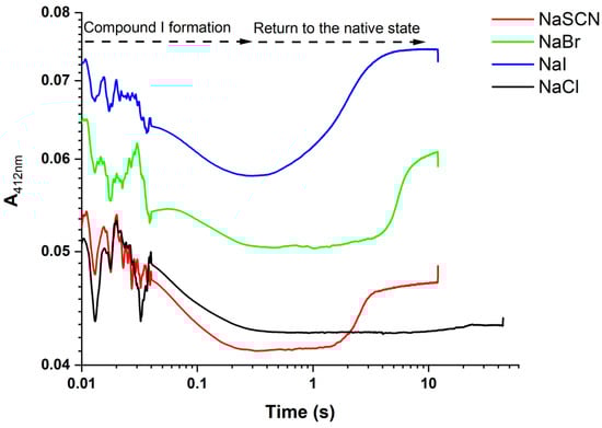 - Furtmüller, P.G.; Burner, U.; Regelsberger, G.; Obinger, C. Spectral and Kinetic Studies on the Formation of Eosinophil Peroxidase Compound I and Its Reaction with Halides and Thiocyanate. Biochemistry 2000, 39, 15578–15584. [Google Scholar] [CrossRef]