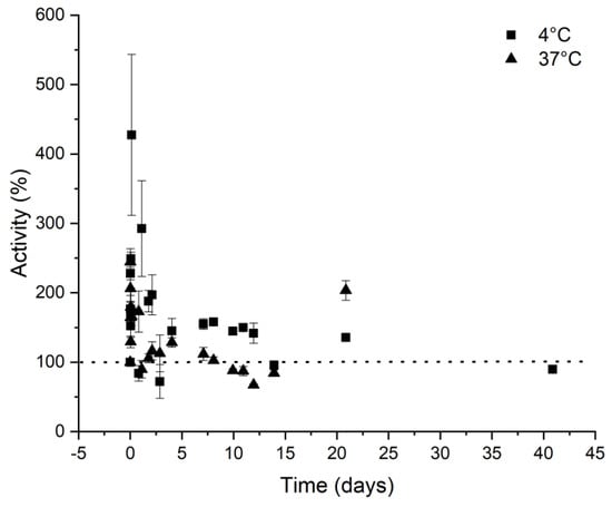 3.7. Activity in Function of Temperature, pH, and Storage Conditions