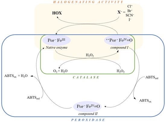 - Arnhold, J.; Malle, E. Halogenation Activity of Mammalian Heme Peroxidases. Antioxidants 2022, 11, 890. [Google Scholar] [CrossRef]