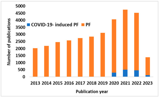Number of publications on PF vs. COVID-19-induced PF. Results of a PubMed search over the last 10 years (as of 10 April 2023) for the terms “COVID-19-induced PF” (blue) and “PF” (orange).