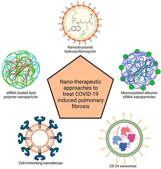 The COVID-19 pandemic has been a major threat to human health. While the medical and pharmaceutical industry has been quick to develop an initial understanding of this disease and developing vaccines, there has not been much focus on the long-term effects of COVID-19 [85]. Partly, this is because the pandemic is about 3 years old, so long-term effects are still being monitored [86,87]. However, a significant percentage of COVID-19-affected individuals have shown a certain degree of lung damage [88]. In rare cases, a few patients with existing lung conditions have developed PF [89,90,91]. Overall, it remains to be seen whether COVID-19-affected patients exhibit progressive PF in the long term. Although PF is a well characterized disease, COVID-19-induced PF might have a different pathophysiology and consequently its own treatment challenges. The current mainstay of therapies for COVID-19-induced PF are still drugs that are indicated for PF. However, recently there has been a shift in the field to evaluate these therapies specifically for COVID-19-induced PF. As a result, there are multiple clinical trials ongoing to assess the efficacy of PF drugs in COVID-19-induced PF [92]. However, the major challenges include safety as well as specificity of these therapeutics. Most of these drugs function by silencing the immune system [93]. Lack of specificity results in non-specific immune silencing, which can lead to many concerning side effects. Nanotherapeutic approaches have shown benefits over similar concerns in the context of other disease areas [94,95,96]. As a result, there are many reports of evaluations of various nanotherapeutic systems in COVID-19-induced PF [97,98,99].