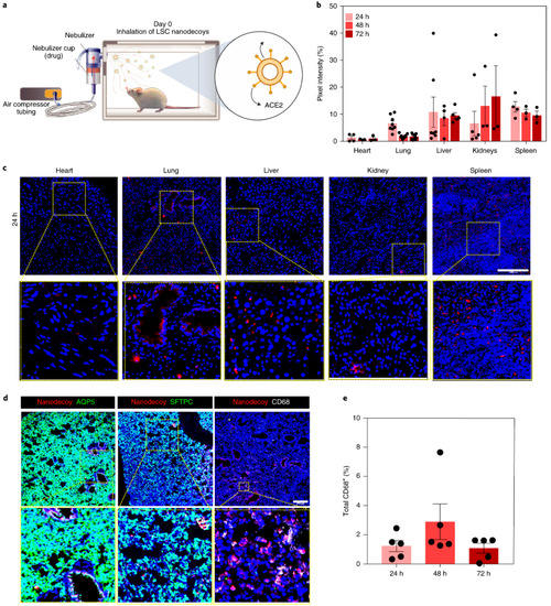 Nanodecoys were generated by serial extrusion of LSCs through polycarbonate membranes with various pore sizes and characterized. The obtained nanodecoys exhibited an average size of 320 nm and were spherical in shape. A yield of approximately 11,000 nanodecoys was obtained from one LSC. Control nanodecoys were also generated from HEK293 cells, which do not express the ACE2 receptors. The authors also demonstrated the ability of nanodecoys to bind to S-protein in a dose-responsive manner. While LSC nanodecoys could competitively bind within 4 h, HEK293 nanodecoys did not show binding to S-protein. In addition, LSC-nanodecoys were internalized more in the macrophage cells as compared to lung cells, indicating that they could be potentially cleared out by the immune cells. Similar studies were also performed to show that the LSC nanodecoys could protect from SARS-CoV2 mimics. The biodistribution of the nanodecoys was performed in CD1 mice (Figure 4). Fluorescent labeled nanodecoys were administered to mice via inhalation route, and biodistribution analysis was performed at 24, 48 and 72 h post administration. The authors reported that nanodecoys could still be found in the lungs 72 h after a single inhalation treatment. In addition, nanodecoys were also found in spleen, liver and kidney, indicating clearance via the reticuloendothelial system (RES). No impact was observed on CD68+ macrophage infiltration, indicating biocompatibility with immune cells. Additionally, the authors also demonstrated that the LSC nanodecoys could significantly reduce the number of SARS-CoV2 mimics that were internalized by lung cells, avoiding further infection. This effect was not observed for the free form of recombinant ACE2 or HEK293 nanodecoys. Confocal microscopy assessments showed that the nanodecoys could accelerate the clearance of the mimics. Cytokine and histopathological assessments of all major organs showed no adverse effects of either LSC or control nanodecoys.