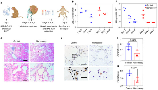 Treatment of SARS-CoV-2 infection in cynomolgus macaques. (a) Schematic demonstrating study design. (b,c) Quantification of viral load in NS and BAL on treatment. (d,e) Representative histological images of lung tissue stained with H&E and IHC staining. (f) Quantification of lung fibrosis using Ashcroft scoring. (g) Quantification of positive SARS-N numbers in lung tissues. Reprinted with permission from Li Z. et al. Nature Nanotechnology volume 16, pages 942–951 (2021) [62]. Copyright 2021 Nature Publishing Group.