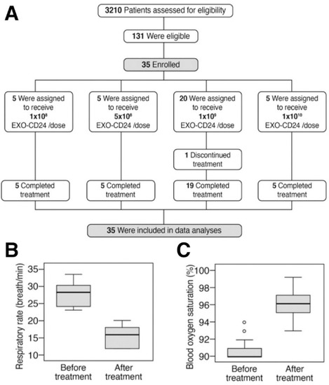Following promising observations in animal studies, a Phase Ib/IIa clinical study was performed mainly with an intent to assess safety, with an additional focus on pharmacokinetics. Thirty-five patients were enrolled in four dose escalation groups (1 × 108, 5 × 108, 1 × 109, 1 × 1010 EXO-CD24/dose) (Figure 7A). An increase in respiratory rate and blood oxygen levels showed the promise of this therapy in treatment of lung injury (Figure 7B,C).