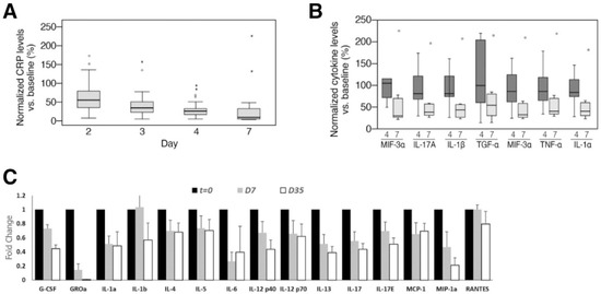 Patients’ systemic inflammatory markers. (A) Plot showing systemic CRP values normalized against day 0 values for 35 patients. (B) Systemic cytokine levels measured in 8 patients on days 3/4 and days 7/8 after treatment with EXO-CD24. (C) Fold change in cytokine levels measured in 24 patients during course of EXO-CD24 treatment. Reprinted with permission from Shapira S. et al. EMBO Mol Med (2022)14: e15997 [63]. Copyright 2022 EMBO Press.