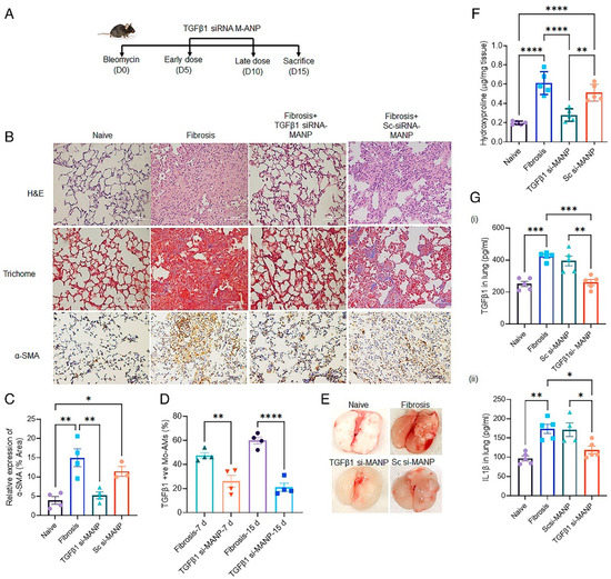 To assess the in vivo efficacy of TGFβ1 siRNA-loaded MANPs, the authors utilized a bleomycin-induced PF model, which was 15 days long (Figure 9A). TGFβ1 siRNA-loaded MANPs were administered on days 5 and 10. On day 15, the mice were sacrificed, and histological assessments were performed (Figure 9B). A marked reduction was observed in the TGFβ1 siRNA-loaded MANP-treated mice. Additionally, a significant reduction in fibrotic mass as well as collagen deposition was observed (Figure 9E). The treated group also showed a three-fold reduction in macrophage proliferation in the lungs (Figure 9F,G). Further assessment was performed to assess the levels of proinflammatory cytokines TGFβ1 and IL-1β in lungs by ELISA. It was observed that the TGFβ1 siRNA-loaded MANP-treated mice showed marked reduction in the cytokine levels.