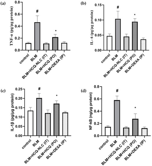 Reduction in pro-inflammatory cytokines (a) TNF-α; (b) IL-6; (c) IL-1β and (d) NF-κβ following treatment with various HCQ formulations. # Significant (p < 0.05) versus all groups. * Significant (p < 0.05) versus the control group and HCQ-NLC group Reprinted with permission from Ali AS. et al. Polymers (Basel). 2022 July; 14(13): 2616 [81]. Copyright 2022 MDPI.