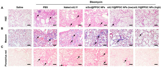 Additionally, the authors assessed the therapeutic efficacy of these NPs in a bleomycin-induced PF mouse model, which is clinically relevant and has been widely used for PF studies [84]. NP-treated mice showed a marked reduction in inflammatory signs (Figure 11). Histologically, a significant reduction in thickness of alveolar septa was observed. Additionally, restoration of impaired alveolar barrier and reduced collagen deposition were observed.