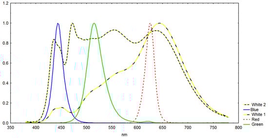 These experiments were performed using an in-house constructed, digitally controlled illumination rig with combinations of LEDs with different colors. The “face” of the rig where LEDS were mounted was 60 × 35 cm. The rig has an integrated power supply, and we can illuminate cultures (here in 500 mL glass beakers) with variable colors, intensities and either linear or pulse width modulated (PWM, 1 Hz to 1 kHz) light. The LEDs (with cooling fans) were controlled with a programmed Raspberry PI unit. The wavelength areas (spectra) applied by us in the experiments were Blue, Red, Green and two types of white (White 1, White 2). White 2 had more shortwave radiation than White 1 light (Figure 1) and the spectra were measured inside the beaker where cultures were illuminated.