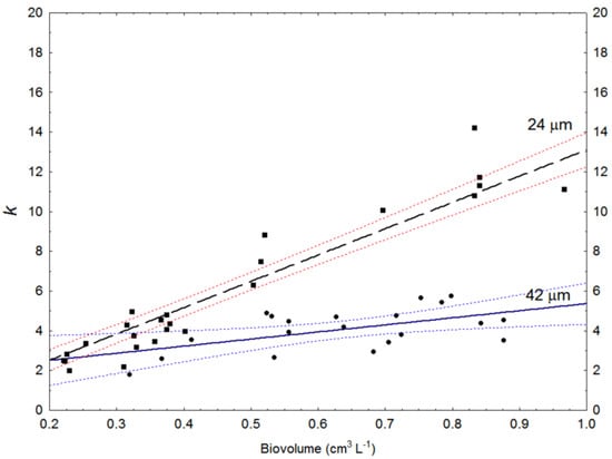 The resulting computed values demonstrates that k increased faster with biomass concentration for small (24 μm) cells than for large (42 μm) cells (Figure 3). For cell biomass concentration, 0.4 cm3 L−1 mean k was 5.8 for 24 μm cells and 3.3 for 42 μm ones, while at 0.8 cm3 L−1 biomass, k values were 10 and 4.5, respectively (Figure 3).