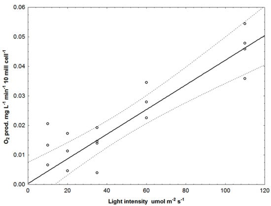 Oxygen production vs. blue linear light intensities (10, 20, 35, 60, 110 μmol quanta m−2 s−1). Dotted lines are 95% confidence regression bands. Data from sequential exposure.