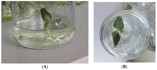 Glass cans with a volume of 150–200 mL were used as a simple hydroponic system (Figure 2). Such systems have been used in previous studies [14]. In this system, microalgae and plants can effectively grow together in a glass container. A Knop solution was added to the Chlorella vulgaris suspension at a ratio of 1:1. The density of chlorella cells in the final suspension was 106 algae cells per 1 mL. The density of the chlorella culture was determined using the Goryaev camera [55]. Then, the resulting suspension was poured into glass cans at a height of 3–4 cm so that it covered the root system of the cucumber plants (Figure 3A). The cans were covered with a polyethylene film, in which small holes were made to reduce evaporation (Figure 3B).