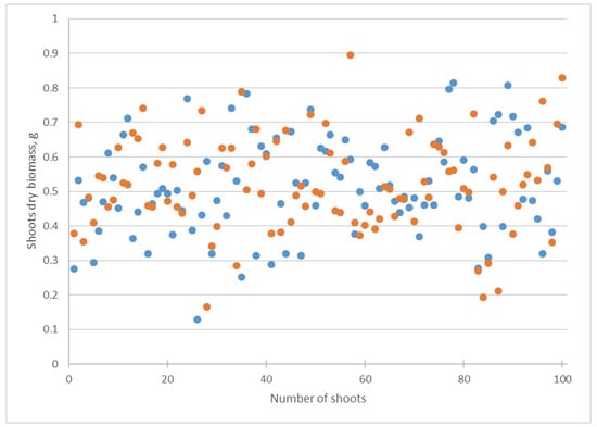 In the experiment with Chlorella suspension, the arithmetic mean of the shoots’ dry biomass increased from 0.50 to 0.53 g (Table 1, Figure 7), but this change was not reliable according to Student’s t-test (Table 1). The insignificance of these alterations was confirmed by other statistical indicators. The standard deviation and median did not change. The coefficient of variation increased insignificantly from 21.00 to 21.72 (Table 1).