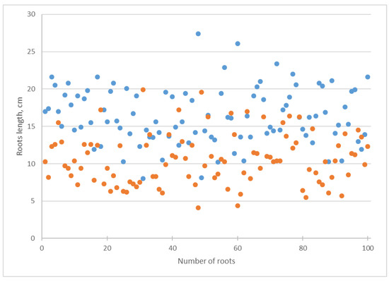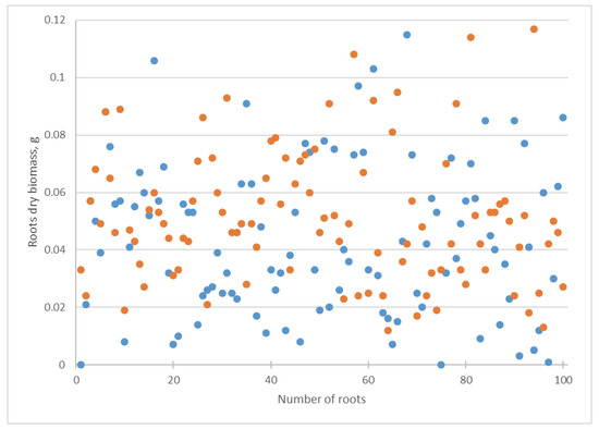 It is necessary to note that roots are a basic plant organ that takes part in the consumption and transportation of water and nutrients, in the synthesis of biologically active substances (hormones, organic, and amino acids), and in fixing plants to the substrate [58,59]. Root biomass is one of the most important aspects of root functioning [60,61,62,63]. The dimensional and morphological characteristics of roots influence the size and development of the shoot and, therefore, future yields [58,64,65].