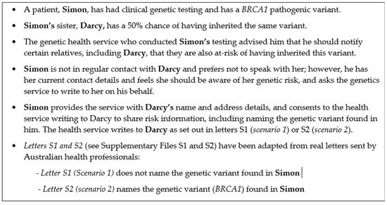 - Tiller, J.; Bilkey, G.; Macintosh, R.; O’Sullivan, S.; Groube, S.; Palover, M.; Pachter, N.; Rothstein, M.; Lacaze, P.; Otlowski, M. Disclosing genetic information to family members without consent: Five Australian case studies. Eur. J. Med. Genet. 2020, 63, 104035. [Google Scholar] [CrossRef] [PubMed]