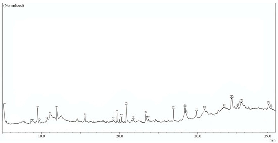 The bioactive elements of Sargassum polycystum extracts were discovered using an Ultra Shimadzu QP2010 Gas Chromatograph Mass Spectrometer paired with an AOC-20i Autosampler. An SH-Rxi-5Sil capillary column MS with a 30 m column length and 0.25 mm inner diameter was utilized for the analysis, and a Vigreux column with a 20 cm length and 2.4 cm inner diameter and an injection volume of 1 L was employed for vacuum fractionation distillation. A 250 mL round bottom flask was filled with 5 g of S. polycystum extract. The flask was next attached to a vacuum pump, fractionation column, and batch jacket, which heated it to 200 °C under 96 kPa of pressure. The distillates were collected at each change in steam temperature during the distillation procedure, and the amounts of alcohol in each fraction were measured. For example, helium carrier gas was used in GC-MS analysis with pressure at 76.9 kPa, injector temperature in splitless mode at 250 °C, carrier gas flow rate at 14 mL/min, and a ratio of 1:10. The ion source and interfaces were 200 °C and 280 °C, respectively, in temperature. The solvent cut-off time was 3 min, and the mass spectrum ranged from 400 to 700 m/z. With a hold time of two minutes, the column’s starting temperature was 110 °C. With a final temperature of 280 °C and a holding period of 9 min at a rate of 5 °C/min, the analysis was carried out at a rate of 10 °C/min up to 200 °C. It took 36 min to complete. The NIST and Wiley libraries were used to determine the bioactive chemicals [19].