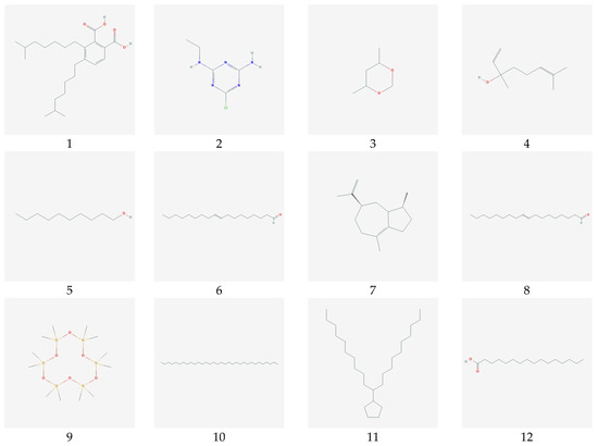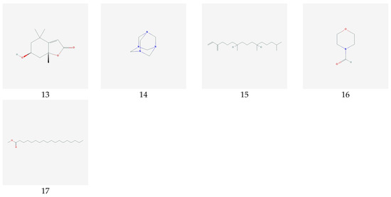 In this study, phytochemicals from Sargassum polycystum were extracted using ethanol as the solvent, resulting in the identification of 17 compounds. The GC–MS chromatograms of these compounds are presented in Figure 1, and detailed information about each compound can be found in Table 1. Analysis of Table 1 reveals that the compound with the highest area percentage (12.85%) is 1,3,5-triazine-2,4-diamine,6-chloro-n-ethyl (C2). On the other hand, the compound with the lowest area percentage (0.99%) is Cyclohexasiloxane, Dodecamethyl (C9). Following these, Methenamine (C14) exhibits an area percentage of 6.73%, while Hexadecanoic Acid (C12) and 1,3-dioxane,4,6-dimethyl (C3) show area percentages of 6.66%, respectively. Other compounds display areas of less than 5%. The majority of the identified compounds are fatty acids or lipids, constituting the prominent phytochemicals derived from this seaweed, as shown in Table 1 (refer to Figure 2).