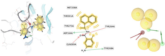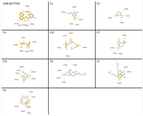 The identification of a structure-based pharmacophore model from PLpro enzyme with its inhibitor Snyder 457 (see Figure 3) revealed five hydrophobic interactions with Met208, Tyr264, Tyr268, Gln269, Tyr273, and Thr301, two hydrogen-bond acceptors from Gln269 and Tyr264 with O atom and two hydrogen-bond donors from Asp164 and Tyr268 with NH and NH2, respectively. Furthermore, the virtual screening result from the pharmacophore model of Snyder 457 yielded nine natural compounds of S. polycystum as follows: C1, C2, C3, C4, C7, C8, C9, C13, and C15 (see Figure 4). The highest pharmacophore-fit score was C4 with four hydrophobic interactions and a 66.04 score with two hydrogen bond acceptors at the OH atom.