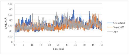 RMSD of PLpro Apo (Grey), PLpro-Cholesterol (Blue), and Plpro-Snyder 457 (Orange).