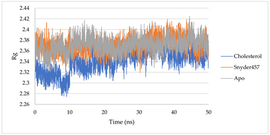 RoG of PLpro Apo (Gray), PLpro-Cholesterol (Blue), and PLpro-Snyder 457 (Orange).