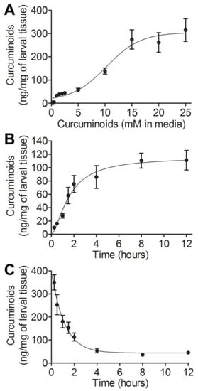 Determination of the influence of time and concentration on curcuminoid uptake in wild type (WT) larvae. Larvae were reared for seven days and the level of curcuminoids in tissues was quantified from groups of 10 crawling third-instar larvae (n = 10 per treatment). Larvae were reared on varying curcuminoid concentrations (A) on 0 mM curcuminoids and transferred to 25 mM curcuminoids (B), or on 25 mM curcuminoids and transferred to 0 mM curcuminoids (C), which resulted in the following equations of best fit: , (r2 = 0.7382); (r2 = 0.7650); and , (r2 = 0.7562), respectively. The mean of experiments conducted in n = 10 is presented, and error bars represent the standard error of the mean.