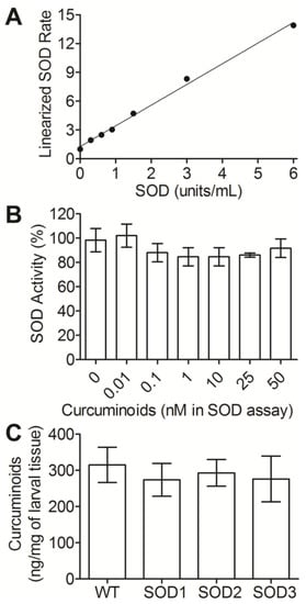 Parameters of the SOD activity assay used herein. A standard curve was prepared with purified SOD (A) with an equation of best fit: , (r2 = 0.9945). The addition of varying concentrations of curcuminoids to the SOD assay, conducted with a constant level of 3 units/mL SOD, is expressed as a percentage of the activity values recorded without the addition of curcuminoids (B). Each of three replicates was conducted in technical duplicate, averaged, and the mean of experiments conducted in triplicate is presented (A,B). Larvae from all strains were reared for seven days on 25 mM curcuminoids and the level of curcuminoids in tissues was quantified from groups of 10 crawling third-instar larvae (C) (n = 10 per treatment). The mean of experiments conducted in n = 10 is presented. Error bars in all panels represent the standard error of the mean. No significant differences were found in the data presented in panels (B,C).