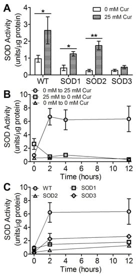 The influence of chronic and acute exposure to curcuminoids on SOD activity in the wild type (WT) and three SOD mutants. Larvae from all strains were reared for seven days on 0 or 25 mM curcuminoids; total protein was extracted, and SOD activity was quantified from groups of 5 crawling third-instar larvae (A) (n = 5 per treatment). WT larvae were reared for seven days on 0 or 25 mM curcuminoids, transferred to 25 mM or 0 mM (the opposite condition) for 2–12 h, total protein was extracted, and SOD activity was quantified from groups of 5 crawling third-instar larvae (B) (n = 5 per treatment). Larvae from all strains were reared for seven days on 0 curcuminoids, transferred to 25 mM for 2–12 h, total protein extracted, and SOD activity was quantified from groups of 5 crawling third-instar larvae (C) (n = 5 per treatment). The mean of experiments conducted in n = 5 is presented, and error bars represent the standard error of the mean; * p < 0.05, ** p < 0.005.