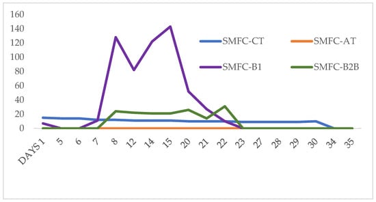 Five out of seven SMFCs generated some electricity and enriched electrogenic bacteria (Table 1 and Table 2). Start-up days for SMFCs ranged from 1 to 11 days. The average electrical generation between all seven SMFC was 155 microwatts. Only SMFC1 and SMFC-AT did not show any positive results. SMFC1 and SMFC-AT did not show any electrical production and no electrogenic bacteria. The fastest generation of electricity was obtained after 1 day by SMFC-CT. SMFC-CT showed 15 microwatts of electricity with 3.19 × 108 electrogenic bacteria. SMFC-B1 showed electrical output after 1 day. However, it was half the value detected by SMFC-CT. It took SMFC-B2B 11 days to produce electricity.