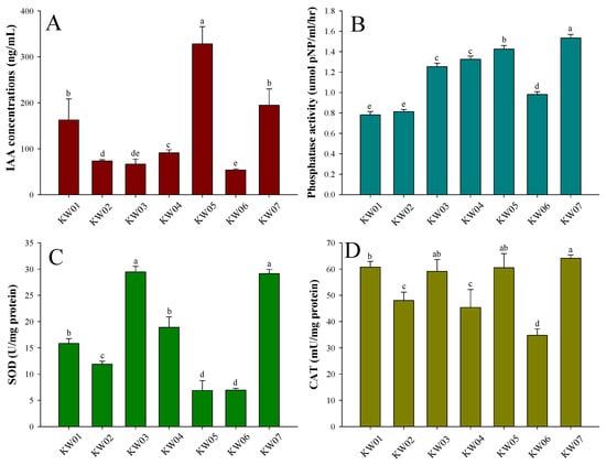 3.2. Effects of Bacterial Isolates on IAA Content, Phosphatase Activity, and Antioxidant Levels