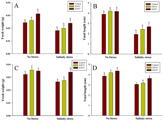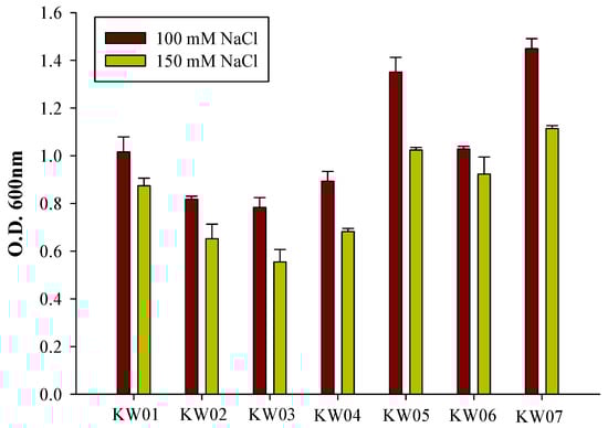 - Khan, M.A.; Sahile, A.A.; Jan, R.; Asaf, S.; Hamayun, M.; Imran, M.; Adhikari, A.; Kang, S.-M.; Kim, K.-M.; Lee, I.-J. Halotolerant bacteria mitigate the effects of salinity stress on soybean growth by regulating secondary metabolites and molecular responses. BMC Plant Biol. 2021, 21, 176. [Google Scholar] [CrossRef]