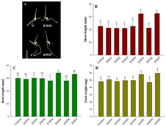 3.6. Influence of KW05 and KW07 on the Growth Characteristics of Mallow and Broccoli