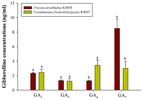 - Kang, S.-M.; Khan, A.L.; You, Y.-H.; Kim, J.-G.; Kamran, M.; Lee, I.-J. Gibberellin production by newly isolated strain Leifsonia soli SE134 and its potential to promote plant growth. J. Microbiol. Biotechnol. 2014, 24, 106–112. [Google Scholar] [CrossRef] [PubMed]