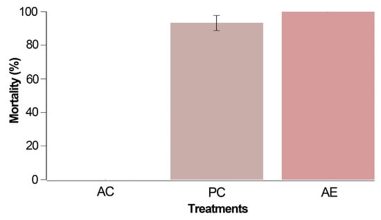 Corrected mortality after 24 h for the preliminary trial carried out with three treatments: AC (absolute control, i.e., T. urticae females without application), PC (positive control using 0.4% chlorfenapyr), and AE (2% Z. schreberi alkaloidal extract). The data are expressed as a percentage ± standard error.