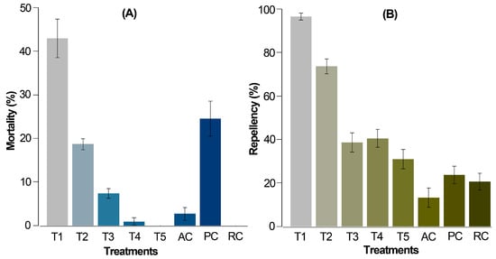 Corrected average mortality (A) and repellency (B) of T. urticae females after 72 h from application by the leaf-immersion method (6 repetitions per treatment and 20 mites per repetition). T1 = 2% extract, T2 = 1% extract, T3 = 0.5% extract, T4 = 0.25% extract, T5 = 0.125% extract, PC = 0.06% chlorfenapyr (commercially recommended dose), RC = relative control, 10% ethanol, AC = absolute control, distilled water. The data are expressed as percentage ± standard error.
