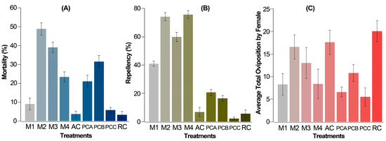 Corrected average mortality (A), repellency (B), and fecundity (C) of T. urticae females. Mortality (A) and repellency (B) after 72 h from the application by the leaf-immersion method for the two replicates (each replicate of 6 repetitions per treatment and 20 mites per repetition). Average fecundity (C) per T. urticae female per day after 120 h from the application by the leaf-immersion method for the two replicates (5 repetitions per treatment, each involving one female). M1 = 0.5% extract, M2 = 0.5% extract + 0.06% chlorfenapyr, M3 = 0.5% extract + 0.075% cyflumetofen, and M4: 0.5% extract + 0.05% abamectin, AC = absolute control, distilled water, RC = relative control, 10% ethanol, PCA = 0.06% chlorfenapyr, PCB = 0.075% cyflumetofen, PCC = 0.05% abamectin. Acaricides were used at the commercially recommended dose. The data are expressed as a percentage ± standard error.
