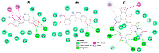 In the TuGST···6 complex, hydrogen bonds were formed between methylenedioxy oxygens and ASP211 and ARG2012 residues, along with a pi–pi interaction involving TYR116 and TRP8 residues. These interactions suggest stability within the simulated complexes, potentially elucidating the compound’s promising acaricidal effect. These findings emphasize the potential of berberine-like alkaloids as acaricidal agents, urging further investigation. The related benzophenanthridine alkaloids, particularly 9, displayed similar pi–pi interactions to 6 (Figure 5B), although the best pose exhibited a differing orientation within TuAChE’s active site. Meanwhile, alkaloid 4 and inhibitor 12 demonstrated distinct binding patterns (Figure 5C,D). Conversely, protoberberine alkaloid 2 lacked an aromatized ring B and pi–pi interactions within TuGST’s active site (Figure 6B) but displayed similar hydrogen bonds to 6. In contrast, inhibitor 13 presented a different binding mode compared to the top-ranked alkaloids for TuGST (Figure 6C).