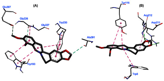 A thorough analysis of the binding mode of the top-ranked compounds for each enzyme was conducted using 2D and 3D interaction diagrams. Specifically, TuAChE and TuGST showed promising interactions with test alkaloids, explaining the outcome of the consensus docking. Berberine (6) is positioned exceptionally well within the active sites of both enzymes (Figure 5A and Figure 6A), exhibiting notable hydrogen bonds and hydrophobic pi–pi interactions. Within the TuAChE···6 complex, critical contacts occurred between the aromatic rings of 6 and TRP193 and TRP230 residues via pi–pi interactions (Figure 5A).