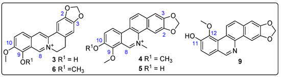 The structure-based virtual screening identified various alkaloids (e.g., 3, 4, 6, 9) as key metabolites significantly influencing the interaction with test enzymes, specifically AChE and GST. To validate this recognition of potential bioactives, five alkaloids underwent purification by semipreparative HPLC separation from Z. schreberi bark extract (vide supra). Their structures were then elucidated using nuclear magnetic resonance (NMR). This elucidation confirmed the annotation of these compounds (i.e., 3–6, 9), identified as known metabolites, as their 13C NMR profiles matched those reported for berberrubine (3) [35], chelerythine (4) [36], fagaridine (5) [37], berberine (6) [38], and zanthoxyline (9) [39], respectively. The structures of these isolated and identified compounds are presented in Figure 8.