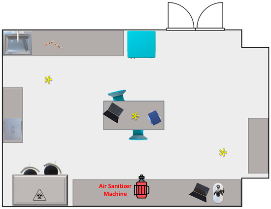Graphic representation, not to scale, of the indoor environment utilized in the experimental sanitization procedures; asterisks indicate the bioaerosol sampling sites.
