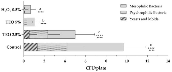 Total microbial levels in indoor bioaerosols before (control) and after sanitization with TEO 2.5% and 5% and H2O2 0.5%. The number of colonies for plates is expressed as the mean ± standard deviation of a triplicate assay conducted at three sampling points. TEO, thyme essential oil; H2O2, hydrogen peroxide. Statistical significance was examined by the two-way ANOVA test with Tukey’s correction (p < 0.05) for comparisons with the control. For mesophilic bacteria, asterisks indicate the statistical significance with respect to the positive control (**** p < 0.0001); for psychrophilic bacteria, hashtags indicate the statistical significance compared to the control (#### p < 0.0001); the absence of symbols indicates the absence of significance. Letters (a–c) indicate the statistical differences between different values; results with no significant differences receive the same letter.