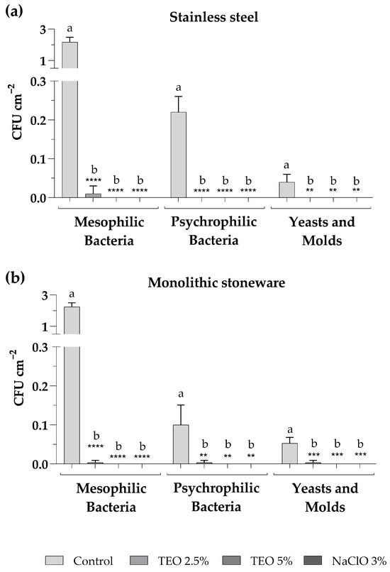 Microbial levels on stainless-steel (a) and monolithic stoneware (b) surfaces, before (control) and after sanitization with TEO 2.5% and 5% and sodium NaClO 3%. The mean values ± standard deviation, obtained from triplicate analyses, are expressed as colony-forming units (CFU) per 1 square centimeter of sampled surface. Statistical significance was examined by the two-way ANOVA test with Dunnett correction (p < 0.05) for comparisons with each control. Asterisks indicate the statistical significance with respect to the positive control (**** p < 0.0001; *** p < 0.001; ** p < 0.01); the absence of asterisks indicates the absence of significance. Letters (a,b) indicate the statistical differences between different values; results with no significant differences receive the same letter.
