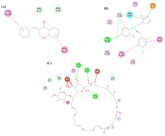 Molecular docking of (E)-3-benzylidene-chroman-4-one (AR25) (A), Miconazole (B), and Nystatin (C) with the molecular target Thymidylate Synthase (5UIV). Pink: alkyl, pi–alkyl, pi–pi T shaped, pi–pi stacked interactions. Lilac: covalent bond. Green: carbon–hydrogen bond and conventional hydrogen bond interactions. Orange: pi–cation and pi–anion interactions. Blue: halogen (Cl, Br, and I) interactions. Red: unfavorable bump interactions.
