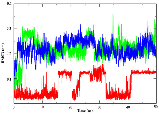 RMSD of the Cα atoms of the compounds. AR25 (red line), Miconazole (green line), and Nystatin (blue line).