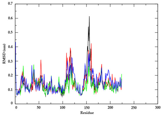 RMSD of the Cα atoms of the enzyme Thymidylate kinase from Candida albicans (PDB: 5UIV) (black) and complexed with the compounds AR25 (red), Miconazole (green), and Nystatin (blue).