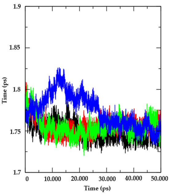 Molecular dynamics (MD) simulations were performed using GROMACS 5.0 software, supported by funding from the Horizon 2020 Program of the European Union (Sweden), to evaluate the flexibility of protein-–ligand interactions [25,26]. The preparation of protein and ligand topologies was conducted using the GROMOS96 54a7 force field. Simulations were performed in a cubic box with the SPC water model for solvent, and system neutralization was achieved by adding Cl− and Na+ ions, followed by minimization to remove unfavorable contacts with solvent molecules. Temperature equilibration at 300 K utilized the V-rescale algorithm for 100 ps under NVT conditions, while pressure equilibration at 1 atm was accomplished using the Parrinello algorithm for up to 100 ps under NPT conditions. Molecular dynamics simulations encompassed 25,000,000 steps over 50 ns. Analysis included calculation of RMSD values for all Cα atoms relative to initial structures to assess structural flexibility and stability compared to experimental data. Additionally, RMSF values were examined to understand the roles of residues near the receptor binding site. Graphical representations were created using Grace software.