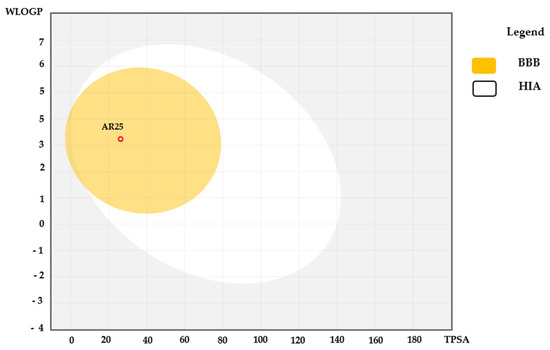 The Boiled Egg diagram illustrates the characteristics of compound AR25. Points located within the yellow area signify molecules predicted to passively permeate through the blood–brain barrier (BBB), while those in the white area denote molecules anticipated to be passively absorbed by the human gastrointestinal tract (HIA). Additionally, red points indicate molecules predicted to be effluxed from the central nervous system by P-glycoprotein.
