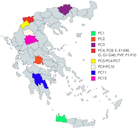 As shown in Table 4, landraces from Agios Germanos Prespes (PC4) showed the highest levels of polymorphisms (P = 86.67%), followed by Kastoria (PC5), Lechovo (PC8), Grevena-Monaxiti (PC9), Arkadia (PC11), and Trikala (PC12); the lowest polymorphisms (P = 66.67%) were shown by Chania (PC1) and Fokida (PC2). The highest level of heterozygosity was shown by Arkadia (He = 0.407) and the lowest by Gigantes (He = 0.164), followed by Elephantes (He = 0.186), which is expected as the Gigantes and Elephantes Prespon are the products of a breeding process with selfing. Overall, the Fst was high (Fst = 0.435) as the populations studied in Table 4 are landraces that have not been the subject of a selection and breeding process, with the exception of “G”, “E”, and “PVP”, thus a high variance is expected.