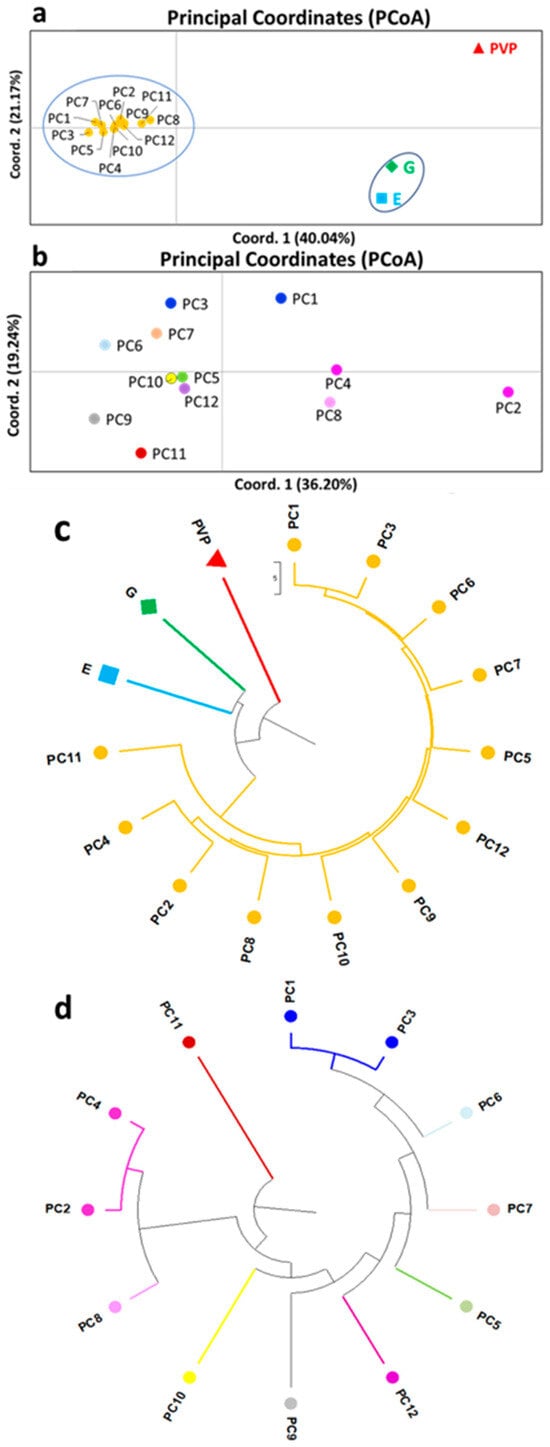 Genetic variation of bean landraces/varieties based on SSR and EST-SSR molecular markers. (a) Principal Coordinate Analysis (PCoA) of twelve P. coccineus L. landraces (PC1–PC12) compared to the Prespon bean landraces/varieties (“G”, “E”, and “PVP”) and (b) PCoA of only the twelve (PC1–PC12) P. coccineus L. landraces. (c) UPGMA dendrogram of the PC1–PC12 P. coccineus L. landraces compared to Prespon bean landraces/varieties (“G”, “E”, and “PVP”), and (d) UPGMA dendrogram of the analysis performed on the PC1–PC12 P. coccineus L. landraces without the Prespon landraces/varieties.
