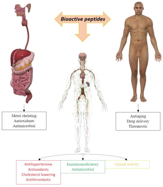 - Akbarian, M.; Khani, A.; Eghbalpour, S.; Uversky, V.N. Bioactive Peptides: Synthesis, Sources, Applications, and Proposed Mechanisms of Action. Int. J. Mol. Sci. 2022, 23, 1445. [Google Scholar] [CrossRef] [PubMed]