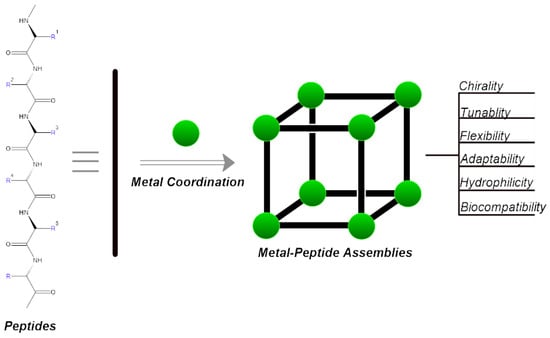 - Dong, J.; Liu, Y.; Cui, Y. Artificial Metal–Peptide Assemblies: Bioinspired Assembly of Peptides and Metals through Space and across Length Scales. J. Am. Chem. Soc. 2021, 143, 17316–17336. [Google Scholar] [CrossRef]